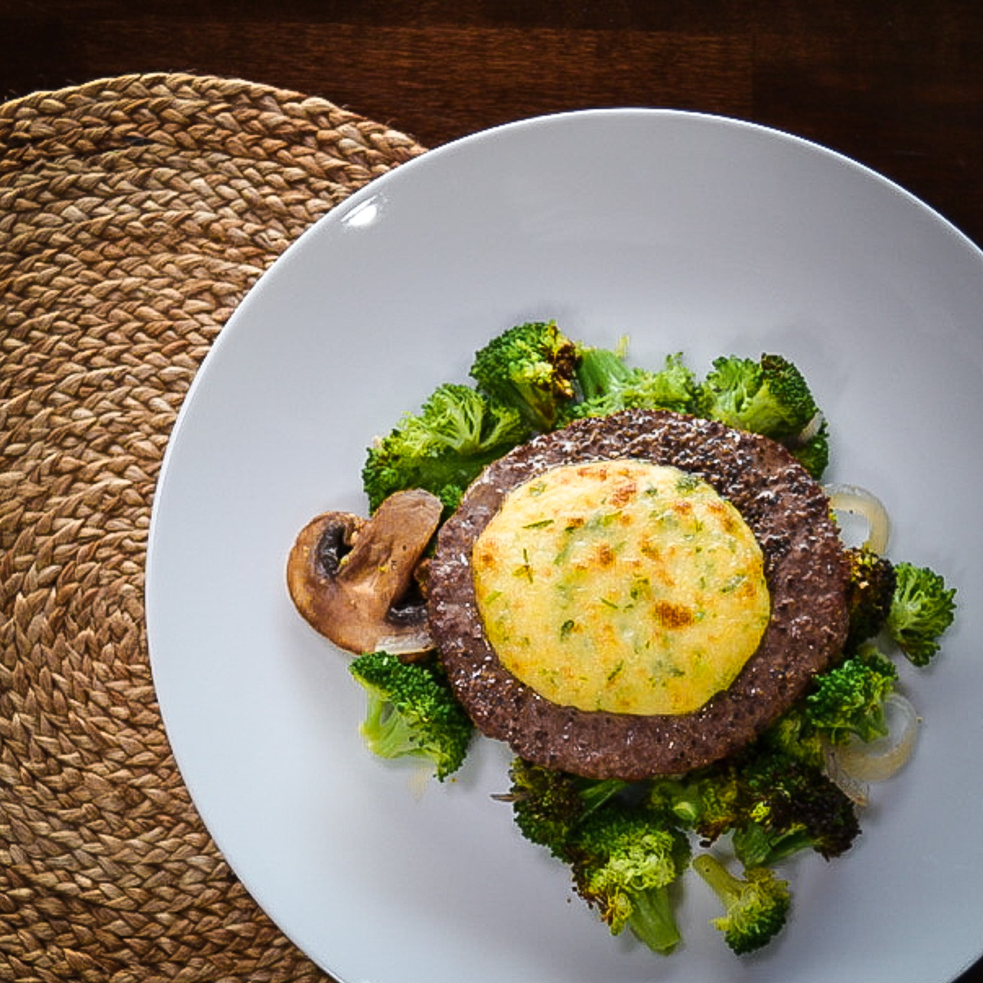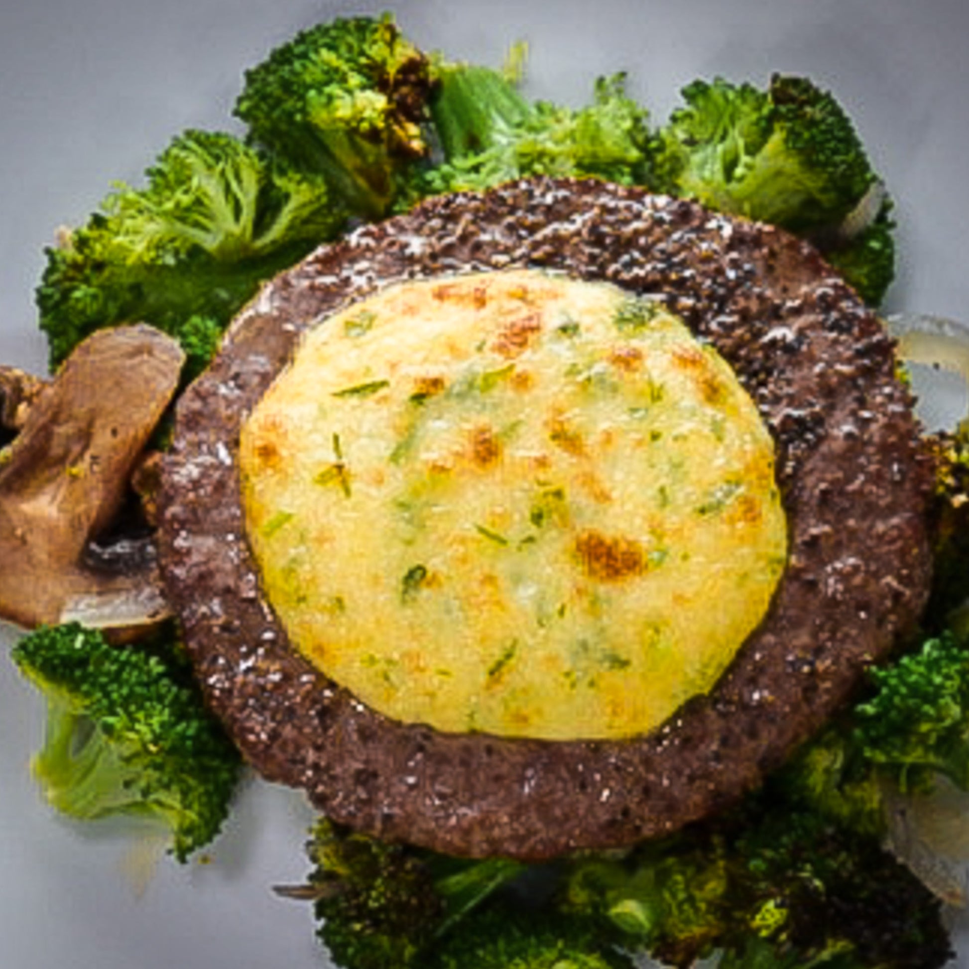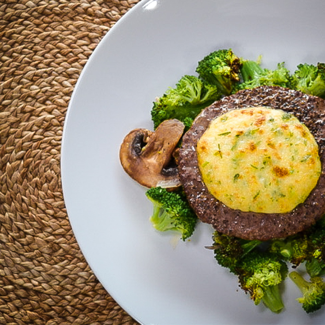 Enjoy our flavorful Parmesan Crusted Chop Steak, made with premium 93/7 ground beef and topped with a homemade parmesan crust. This delicious steak is served over a bed of roasted broccoli, red onions, and mushrooms, creating a perfect harmony of savory flavors and textures. Indulge in this hearty and satisfying meal, crafted to delight your taste buds.